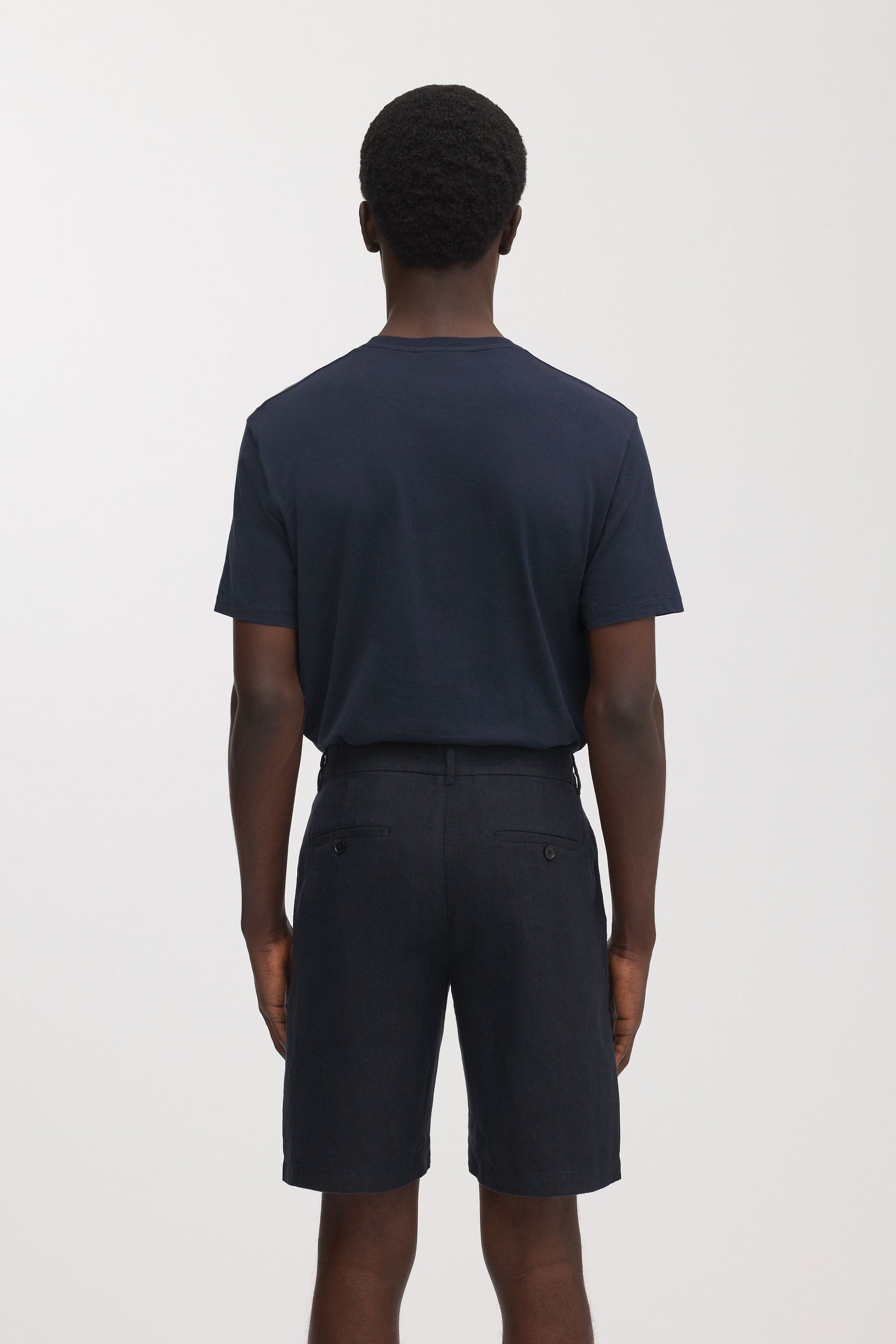 Regular fit linen shorts made from lightweight Belgian linen plain weave. Featuring an elasticated waistband with drawstring, slanted side pockets and welted back pockets. Cut and sewn in Portugal.