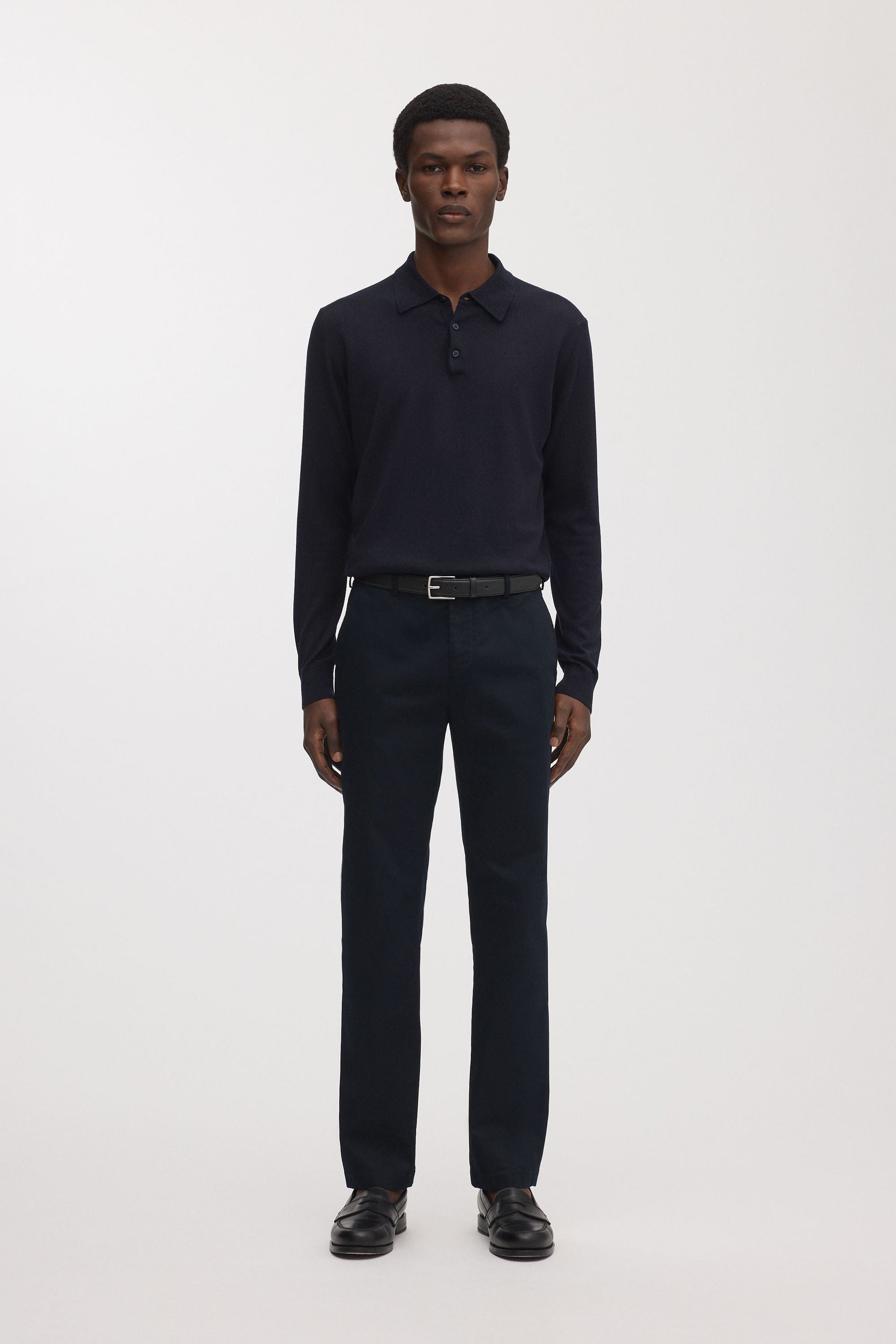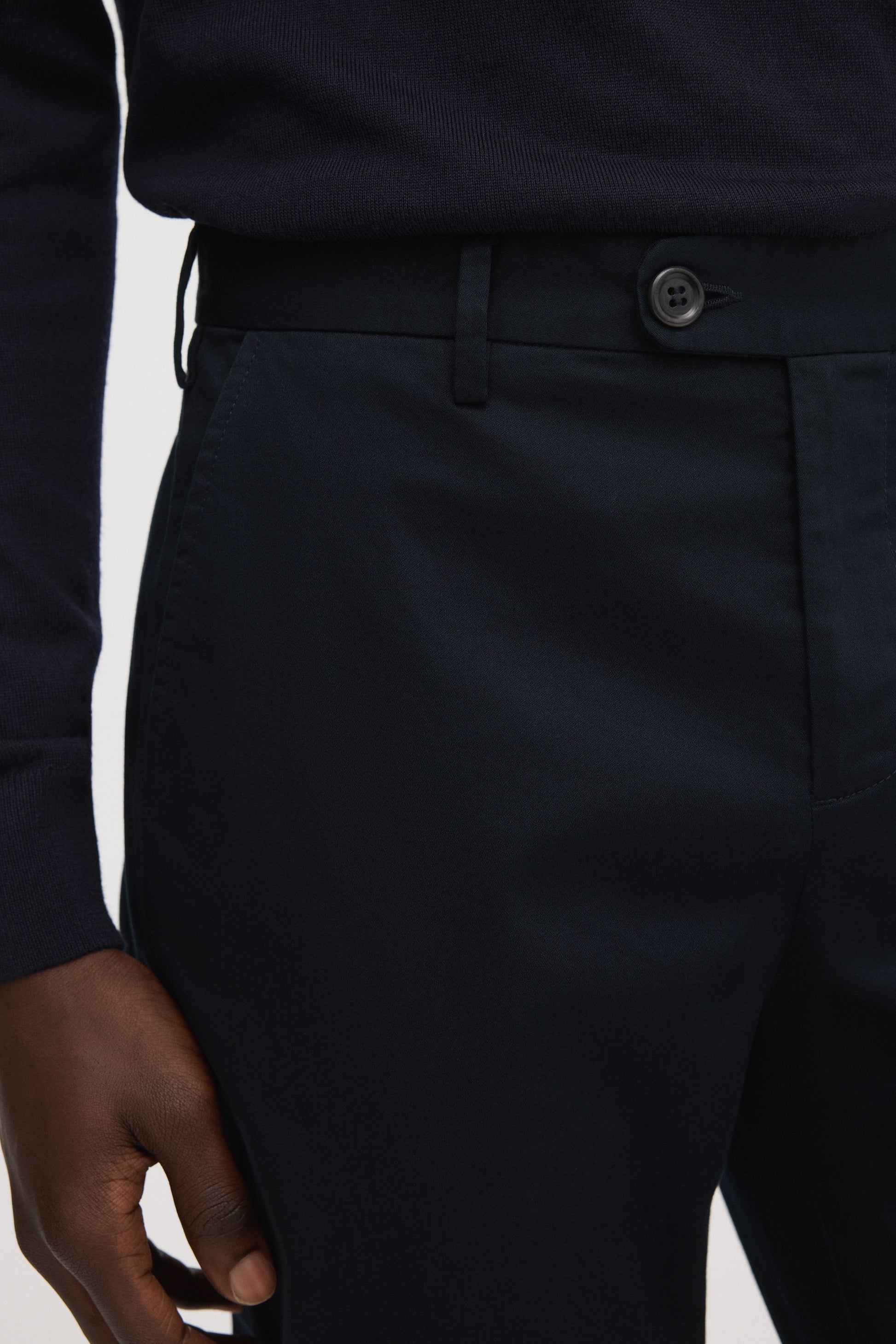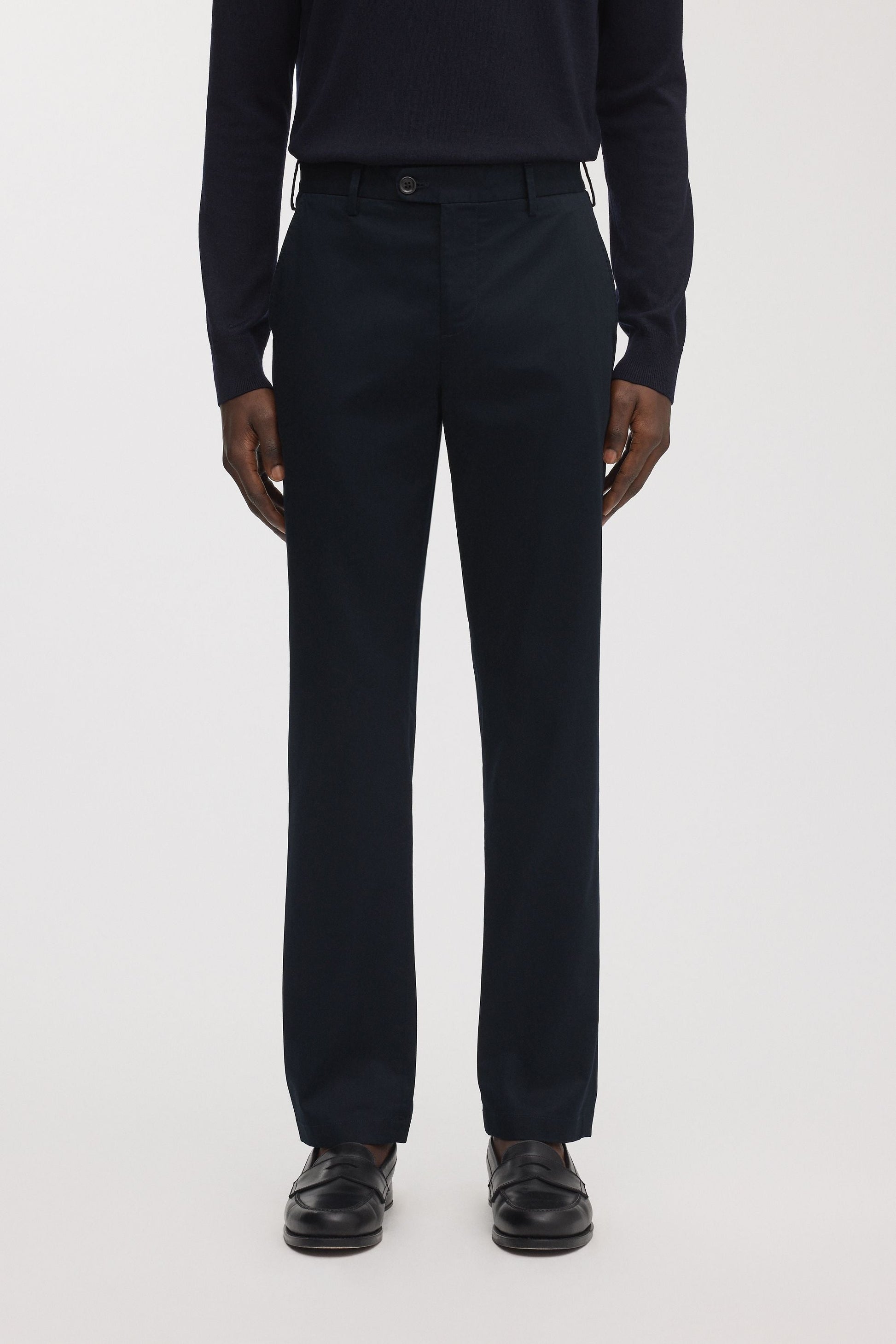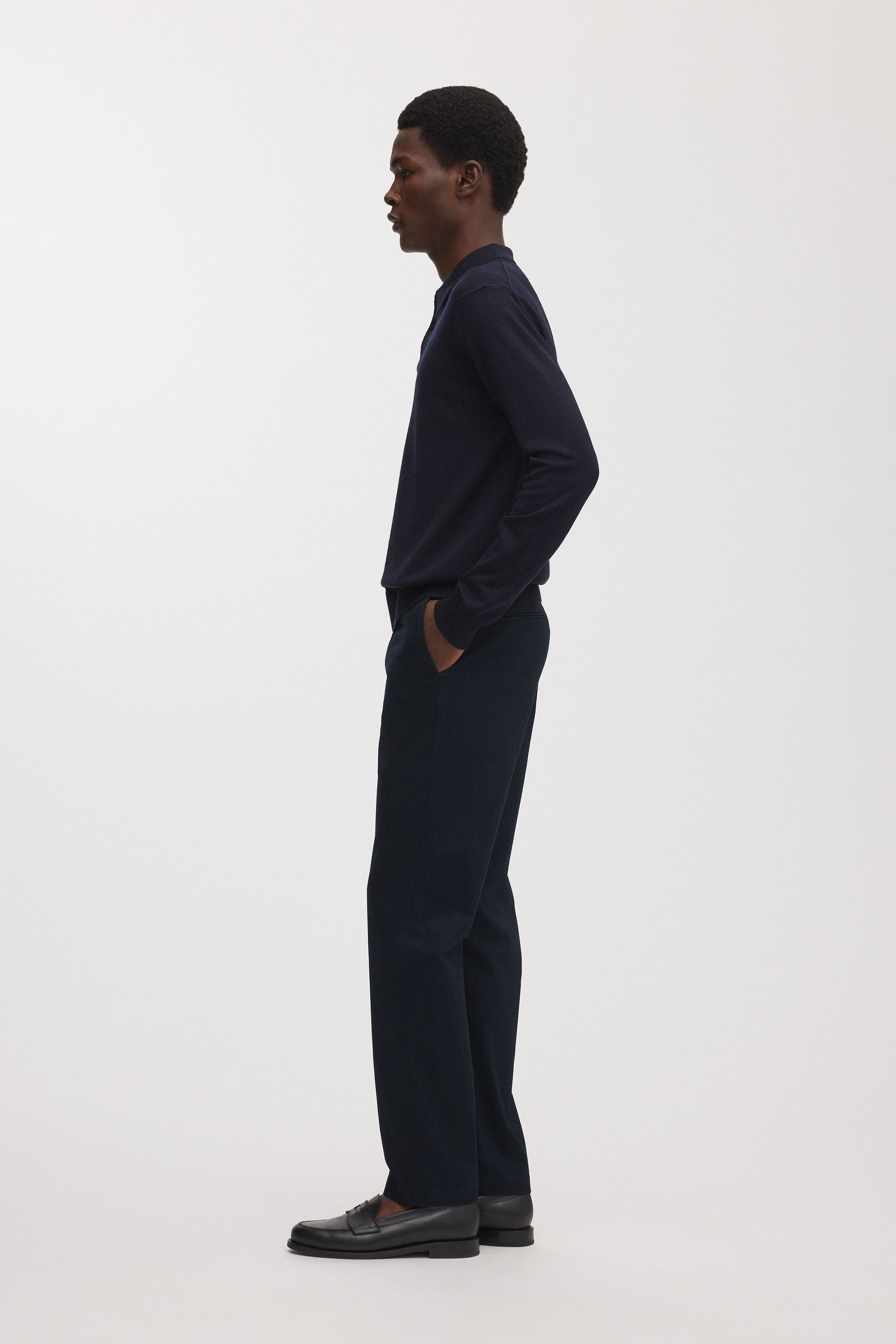 Mid-rise regular chinos made from 98% organic cotton and 2% elastane sateen with tailored details and a straight leg. Cut and sewn in Portugal.