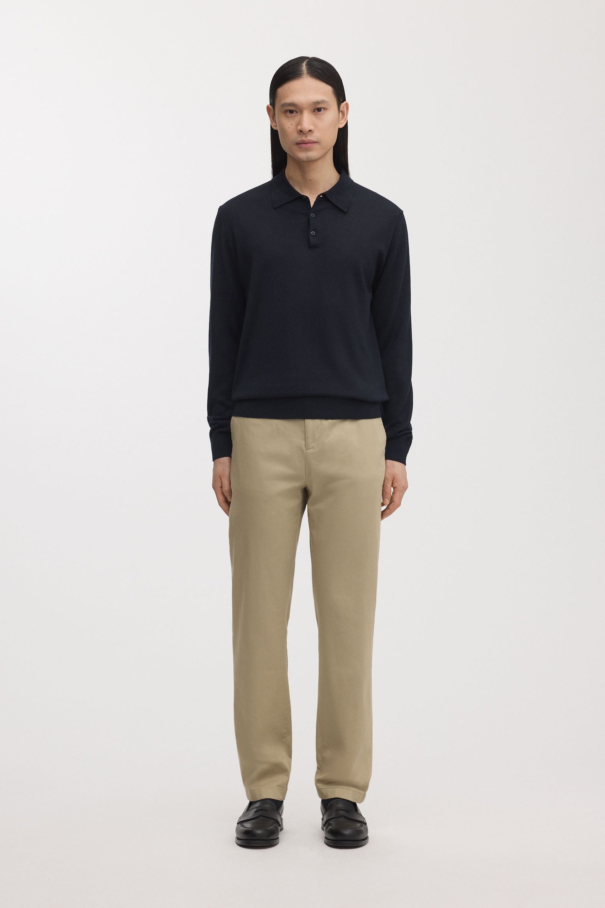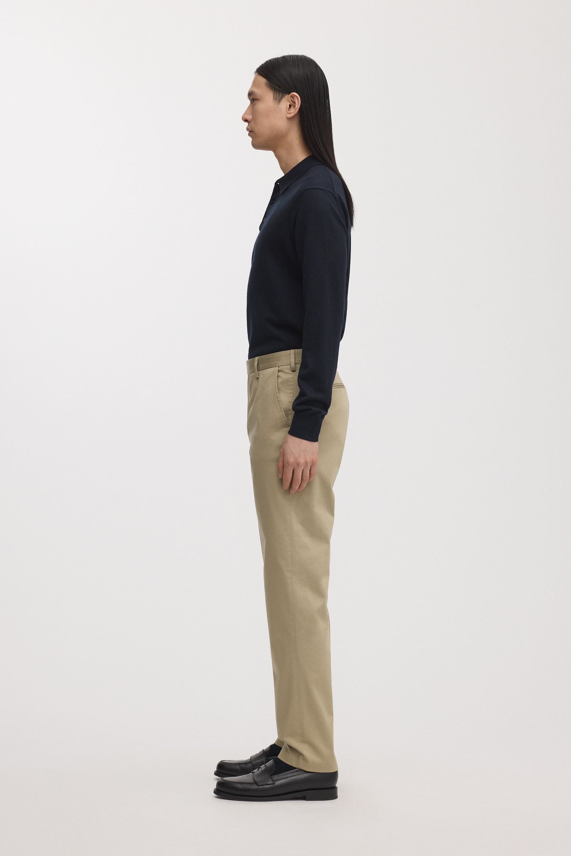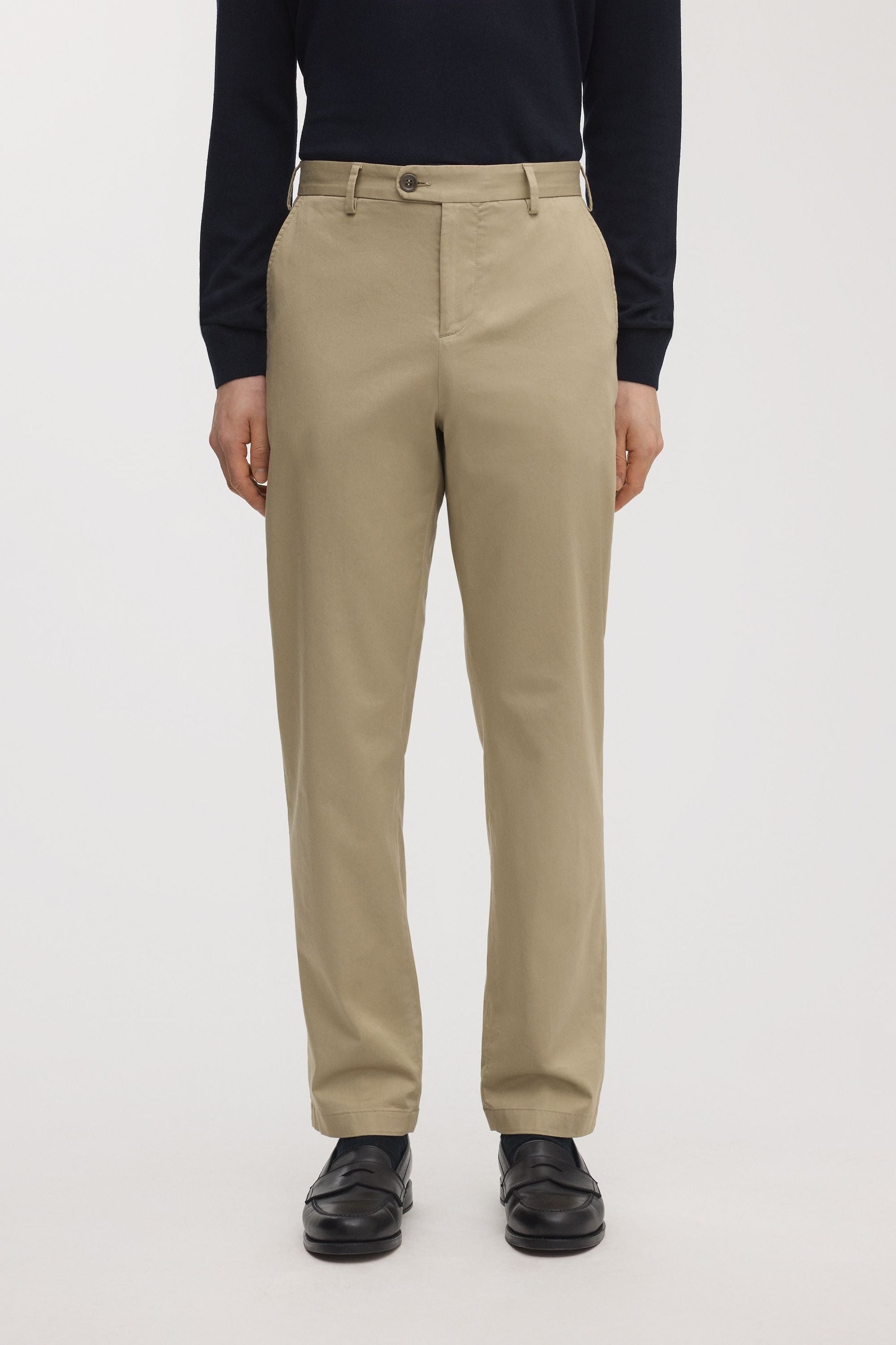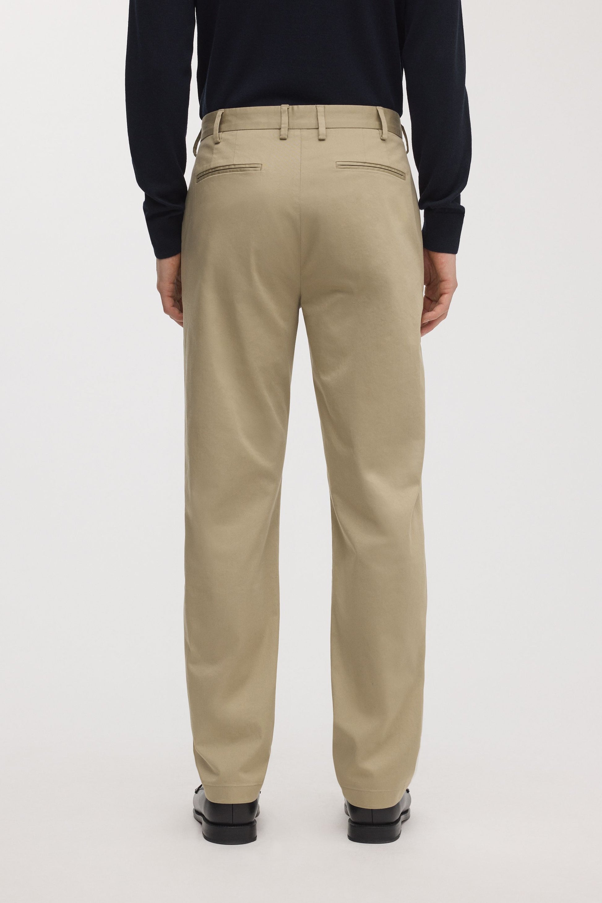 Mid-rise regular chinos made from 98% organic cotton and 2% elastane sateen with tailored details and a straight leg. Cut and sewn in Portugal.
