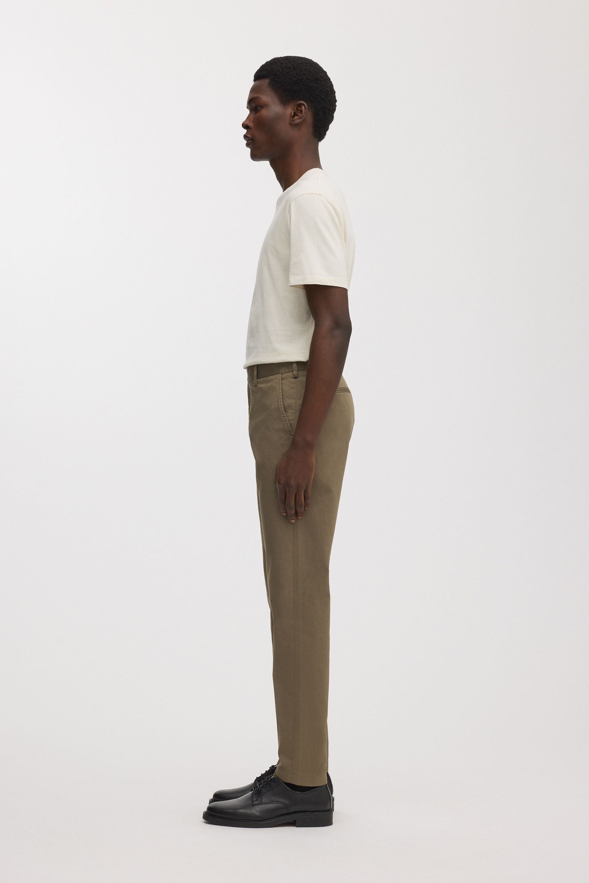 Mid-rise slim chinos made from organic cotton sateen with added stretch for comfort and durability. Featuring a tailored silhouette with a tapered leg. Cut and sewn in Portugal.