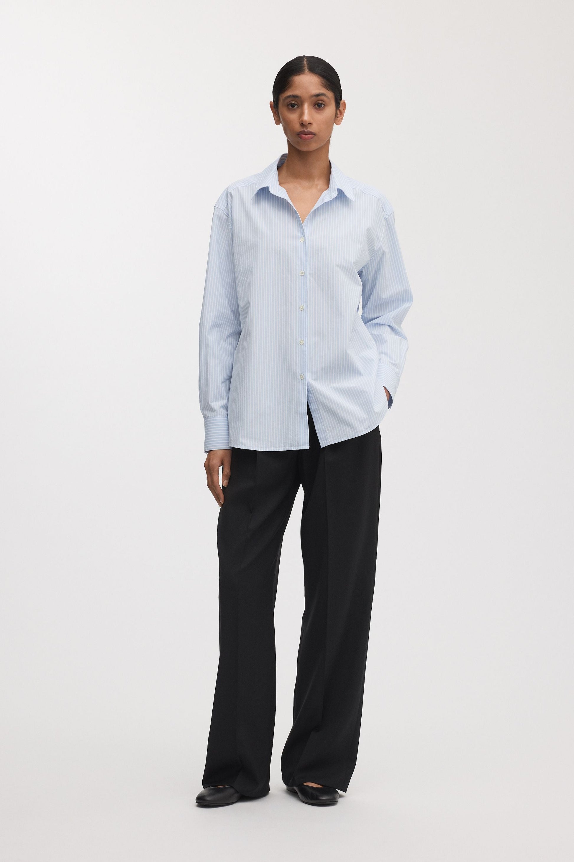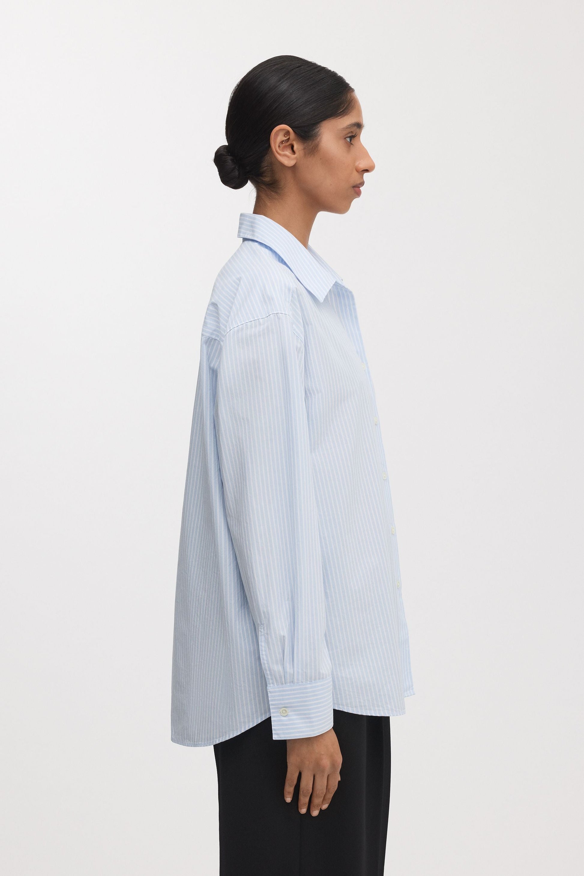 A breathable, crisp poplin shirt woven from 100% organic cotton in a lightweight 130 gsm weave. Features a seamless French placket, cut-away collar, inverted box pleat at the back and single button cuffs with mother-of-pearl buttons. Cut and sewn in Portugal for effortless everyday style.