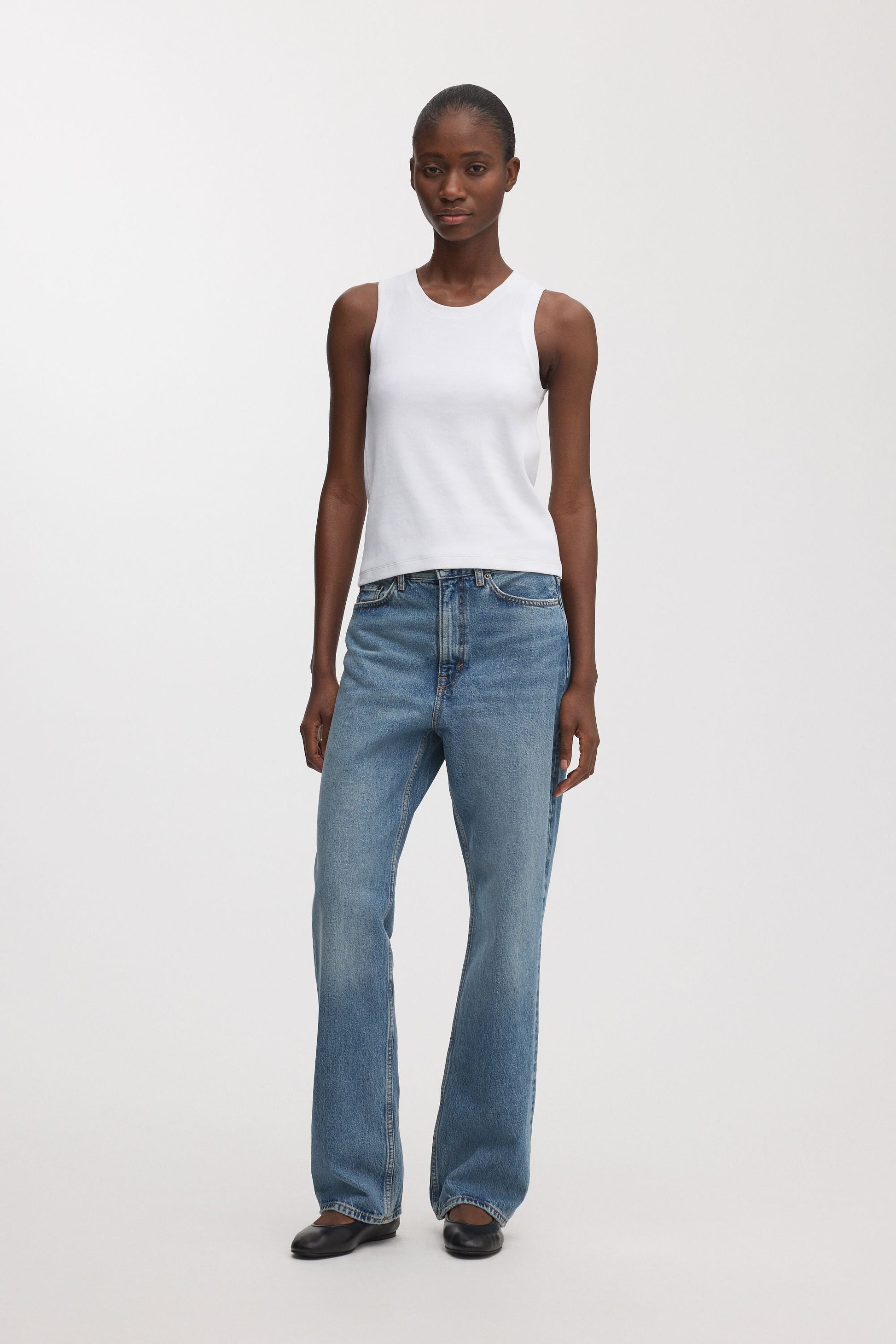 A rib knit tank top made from 97% organic cotton and 3% elastane with a soft, breathable handle, neatly ribbed neckline and sleeve openings, and slightly scooped neck. Milled, cut and sewn in Portugal.